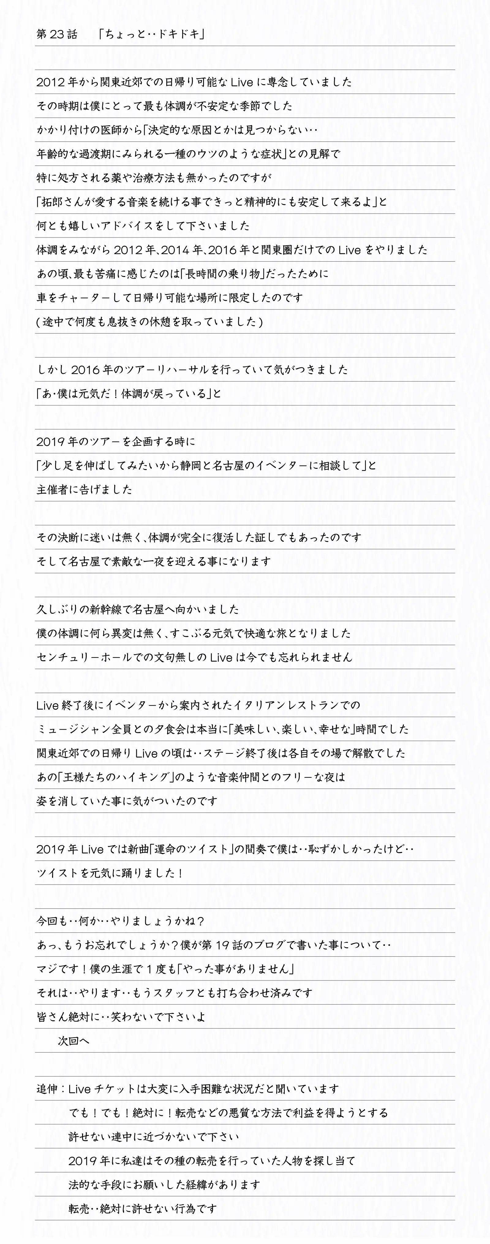 オークション・SNS・転売サイト・金券ショップ等でチケットを転売・交換・譲渡や、そのチケットを購入することは絶対におやめください。尚、そのような行為が発覚したチケットは全て無効とし、出品者およびエントリー者の当日入場をお断りいたします -